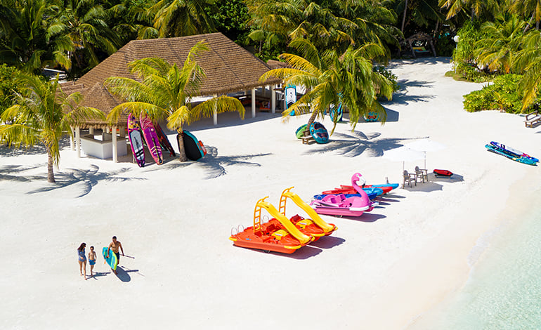 Located in North Male Atoll, it’s lined by natural channels that leads into over 30 dive sites around the island. The channels and a world-renowned house reef are just yards from the shore, and thriving open-sea marine life surrounds the island for some of the purest viewing imaginable. Guests of all skill levels can enjoy safe reef explorations or advanced channel dives guided by the team at the PADI-certified dive school on site, but a dedicated snorkeling jetty and complimentary use of this equipment is suitable for all ages, including children sure to be enchanted by what’s under the sea.