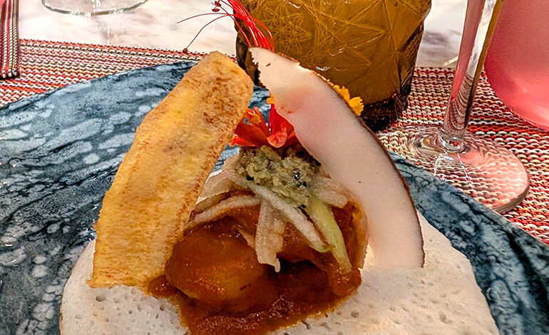 The “Second Time” was a medley of intriguing textures. Large marinated prawns cooked in an onion and tomato base and topped with coconut chutney sat majestically on a bed of lentils over QQ rice flour-based pancake. A fried plantain chip, cut vertically and delightfully crunchy, provided a crunchy contrast to the pancake, and refreshing coconut and edible flowers crowned the whole thing.