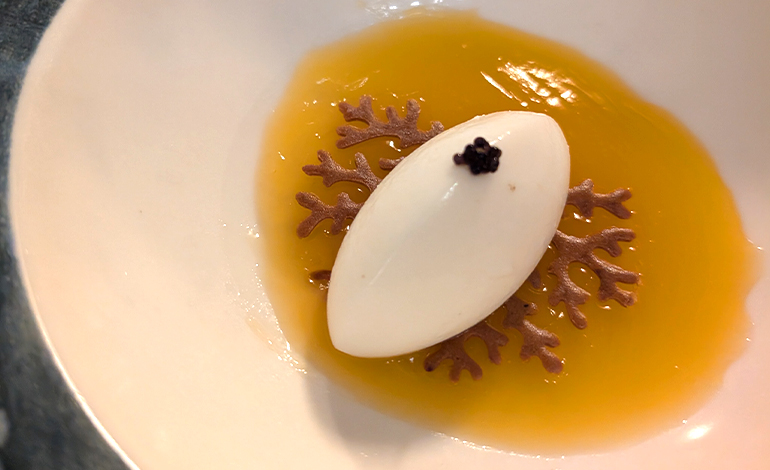 The “Fourth Time” was a palate cleanser – a quenelle of a panna cotta-like dessert made with yogurt. A caviar accent added some saltiness to the sea of passionfruit-mango sauce the dessert was swimming in, and a delicate cookie – a different oceanic shape for nearly all of us – gave us something to chew on.