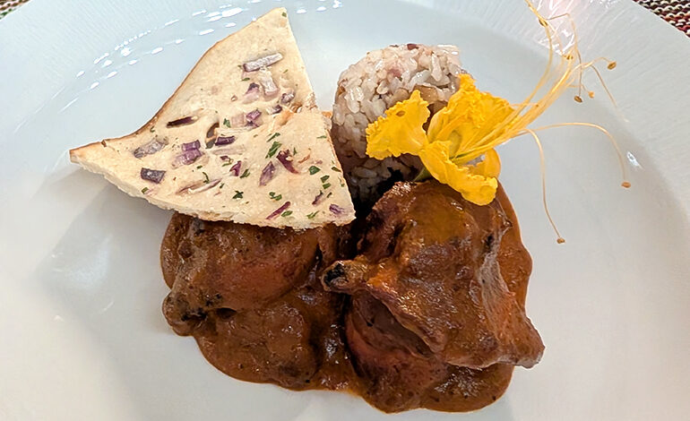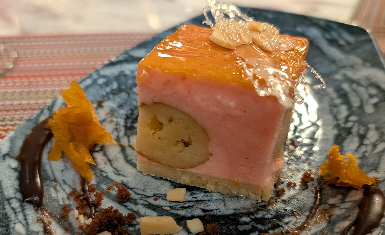 For the last “time,” bellies already fit to burst, was the mysterious “cheesecake” dessert. Described as cheesecake with gulab jamun (fried milk powder balls), it was a surprise to all when we were presented with a pink cheesecake with cake-like spheres baked right into it! A clear glaze held the small abstract sugar sculpture in place, and for more flavor contrast, chocolate “dirt” crumbles and a sweet carrot chutney were anchored by fudge. Full chai service accompanied, milky and rich, for a culinary journey to India visitors to Punta Cana could never forget.