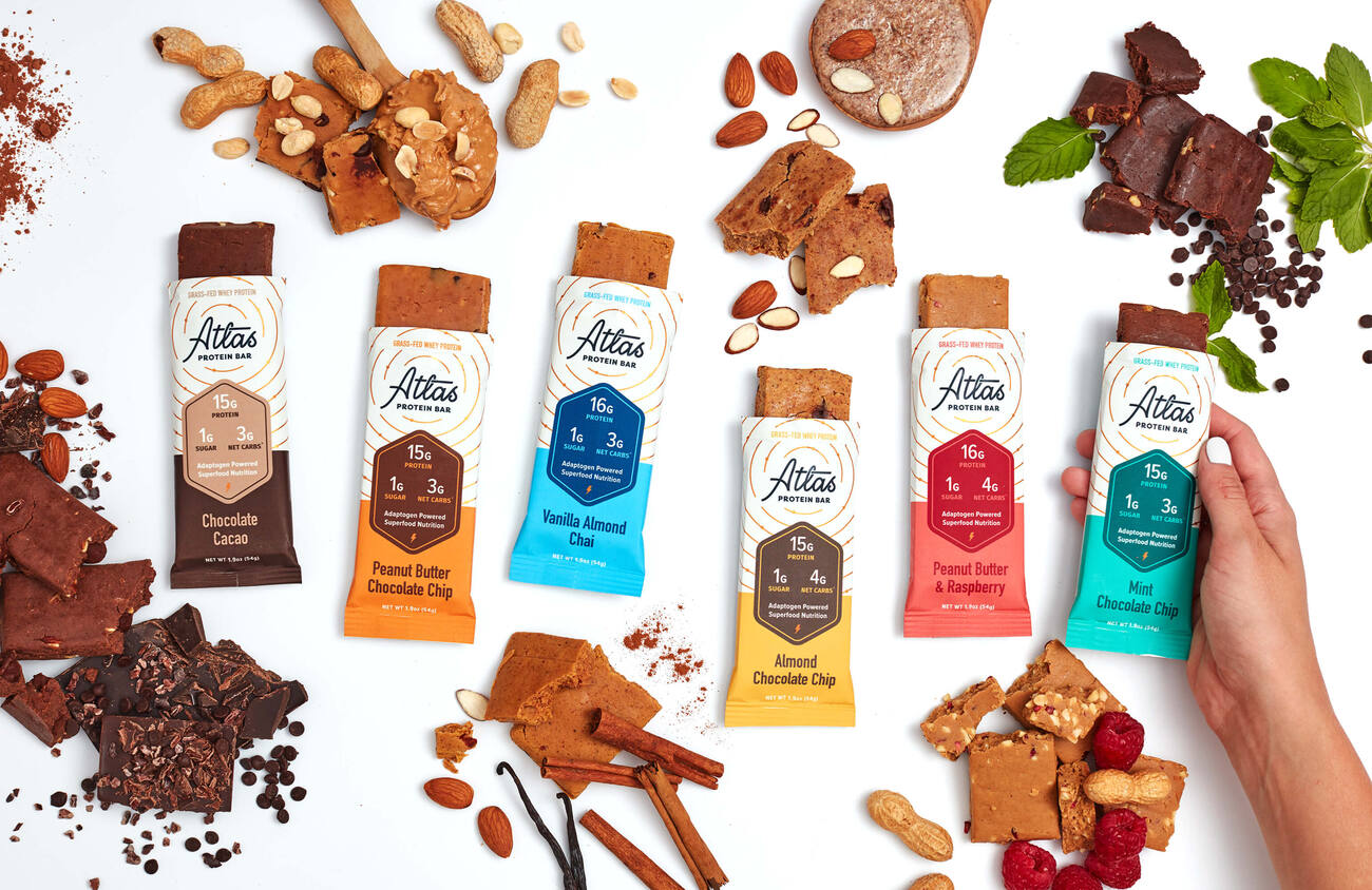 Atlas Adaptogen Bars in packaging and out with ingredients laid out next to them