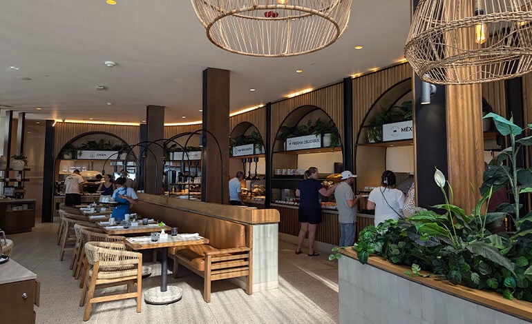 The two current buffets are also anything but dated. Faro Gastro Market is semi-self-serve, with clearly labeled kiosks that are fully staffed wrapping the back half of this outlet. Dining is oceanfront, though, from most tables, and patio seating is also available.